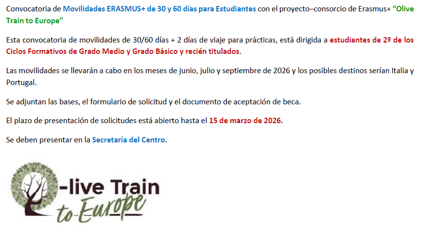 Movilidades ERASMUS+ de 30 y 60 días para estudiantes de 2º CFGM y 2º CFGB